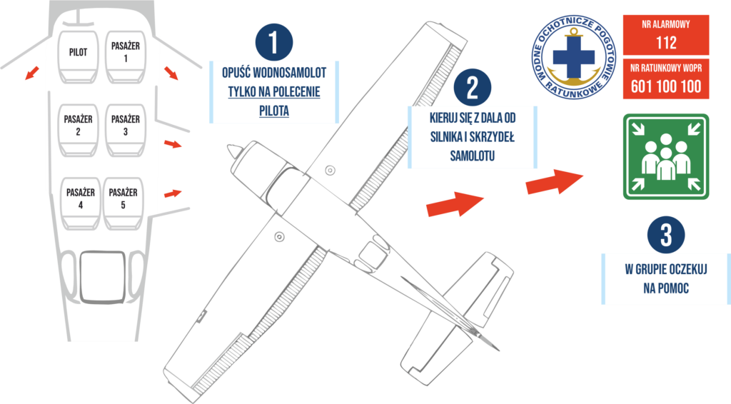 Pamiętaj, aby w sytuacji awaryjnej zawsze postępować zgodnie z poleceniami pilota wodnosamolotu! Jeżeli Źle się poczujesz lub doznasz urazu - natychmiast poinformuj pilota. jeżeli twoje urządzenie elektroniczne zacznie się DYMIĆ lub palić - natychmiast poinformuj pilota.
